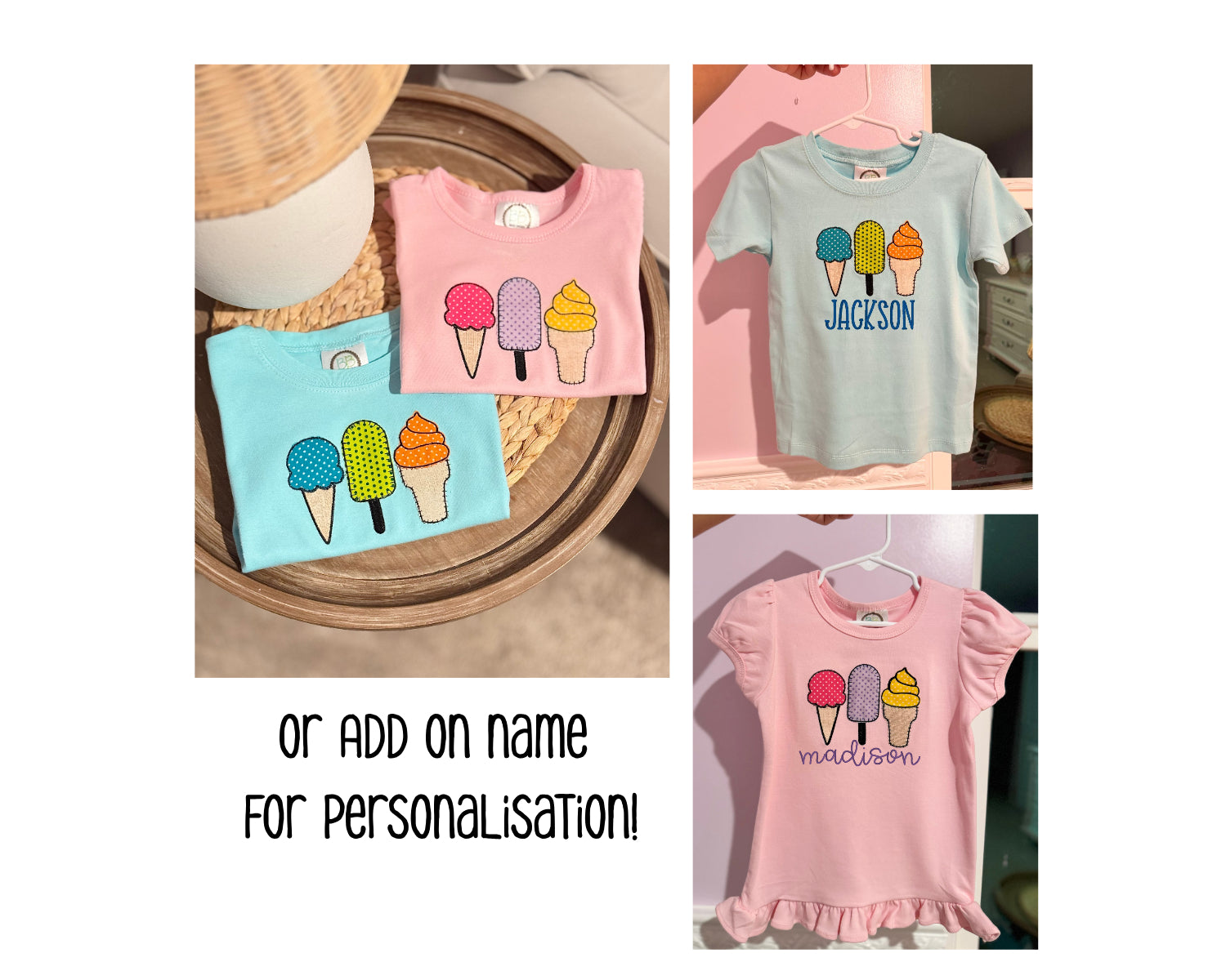 OPTIONAL: Add-on your child's name for a more fun and personalised touch! (child's name will be embroidered below the ice cream design as shown in the picture.)